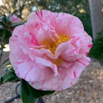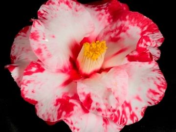 Large to very large , Semidouble. White with multiple red and pink streaks in various lengths throughout the flower with yellow anthers and white filaments; at times there may be pink shading on the petals .