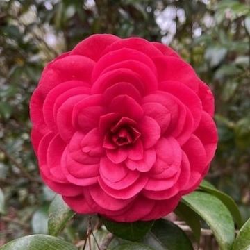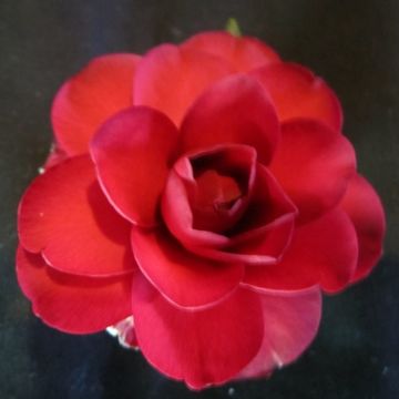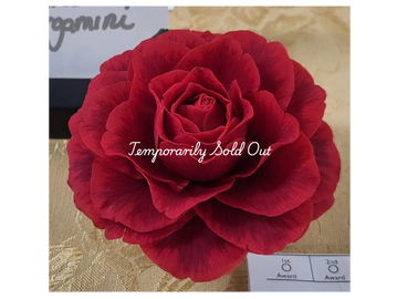 Medium , Semidouble to rose form double. Very dark glossy red .