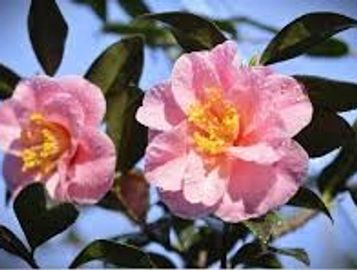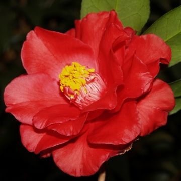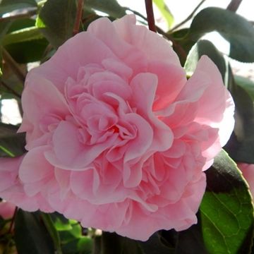 Large , Semidouble with creped petals. Glossy salmon red . Unique crinkled holly-like foliage