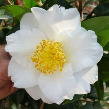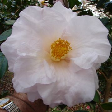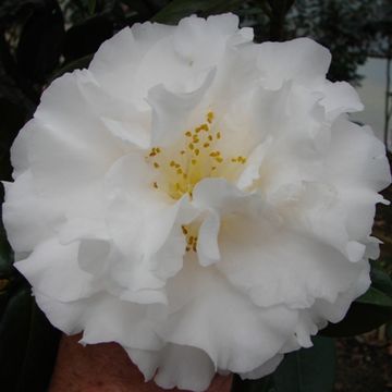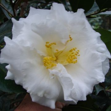 Large to Very Large, Semi double with wavy petals. White .